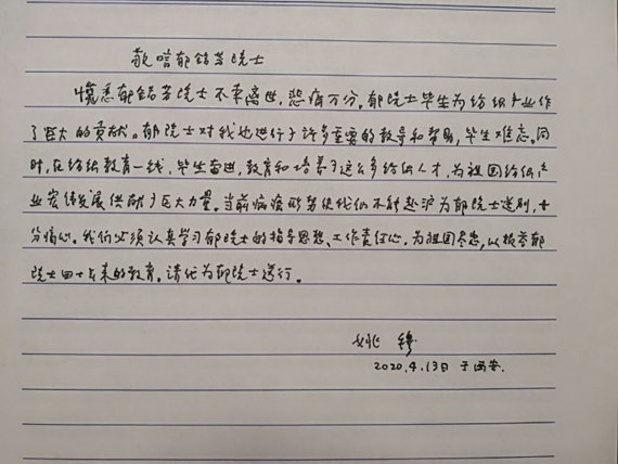 惊悉郁铭芳院士不幸离世,悲痛万分。郁院士毕生为纺织产业作出了巨大的贡献。郁院士对我也进行了许多重要的教导和帮助,毕生难忘。同时,在纺织教育一线,毕生奋进,教育和培养了这么多纺织人才,为祖国纺织产业宏伟发展贡献了巨大力量。当前病疫形势使我们不能赴沪为郁院士送别,十分痛心。我们必须认真学习郁院士的指导思想、工作责任心,为祖国尽忠,以报答郁院士四十年来的教育。请代为郁院士送行。