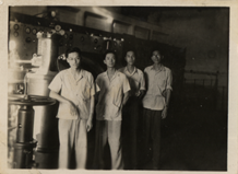 (1947夏,郁铭芳(右二)与大学同学于文潮(左一)、黄尚德(左二)、郎庆海(右一)在南京龙潭中国水泥厂实习)