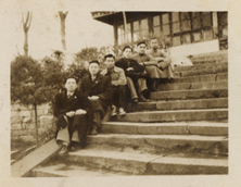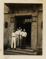 (1948年,郁铭芳与大学同学在圣约翰大学宿舍前合影,左起依次为郁维新、陈允湛、郁铭芳、郎庆海、于文潮)