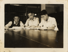 (郁铭芳(中)与大学同学于文潮(左)、郎庆海(右)在圣约翰大学图书馆学习)