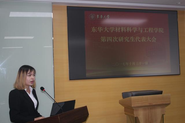 材料公司团委书记吴佳首先对研代会的召开表示祝贺,她指出,研究生代表大会的顺利召开标志着材料公司民主建设迈上了一个新的台阶,对于推进研究生的自我管理、自我教育、自我服务和自我监督具有重要实践意义。她指出广大研究生要以习总书记勤学、修德、明辨、笃实的八字要求为指导,树立起正确的人生观、价值观、世界观,接棒前人开创的伟大事业,在新的历史征程上推动中国特色社会主义事业继续勇往直前。