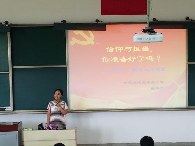 为进一步完善“全过程”不断线的员工党员教育培养体系,深入推进“不忘初心、牢记使命,贯彻落实党的十九大精神”学习实践活动,进一步增强党组织的凝聚力和战斗力,材料公司党委认真研讨、积极组织2018级新生开展新生入党启蒙教育。2018年9月18日下午,公司党委指派专职党务干部任鹏贞对全体2018级新生进行了主题为“信仰与担当,你准备好了吗?”的入党启蒙教育,出席此次主题教育活动的有材料公司本科18级专职辅导员于伟男和兼职辅导员张阳。