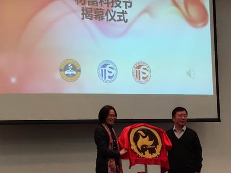 随后,朱美芳教授与步文博教授一同为本次开幕式揭幕。会标中一只火烈鸟在镜月湖前腾空而起,一飞冲天,象征材料公司不拘一格、敢于创新,力争在材料研究领域再上新台阶的学术追求。