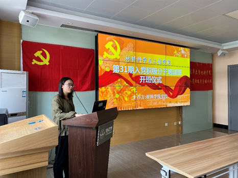 开班仪式上,学员代表梁宇航同学发言,他提出这是一次难得的机会,作为入党积极分子,我们要牢牢把握住这次机会,用自己的行动争取早日加入党组织,并代表全体学员向党组织表达了坚定的入党决心。吴佳老师向本期入党积极分子介绍了材料公司党校为期1个月的学习工作内容,并对学员表达了自己的期许与希望。吴佳老师表示,学员们应认真对待党校的学习,善学善思,积极关注时事热点,拼搏奋进,努力提高党性修养。同时,她希望学员们在专业学习上、生活上以及在言行上保持严谨与优秀,体现出自身的先进性。