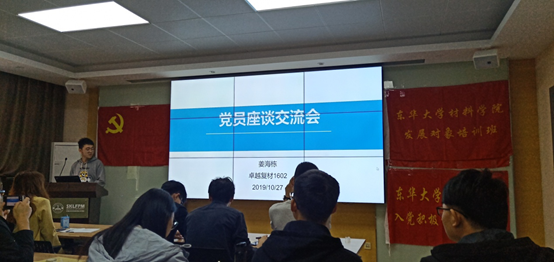 2019年10月27日上午9:30,yl23455永利集团材料公司党校在材料公司C321教室举行优秀党员座谈交流会,材料公司入党积极分子培训班学员、发展对象培训班学员共同参与。本次座谈会邀请了材料公司2016级优秀党员徐朝晨和姜海栋同学与学员们分享加入中国共产党的经历以及在大学的学习经验。