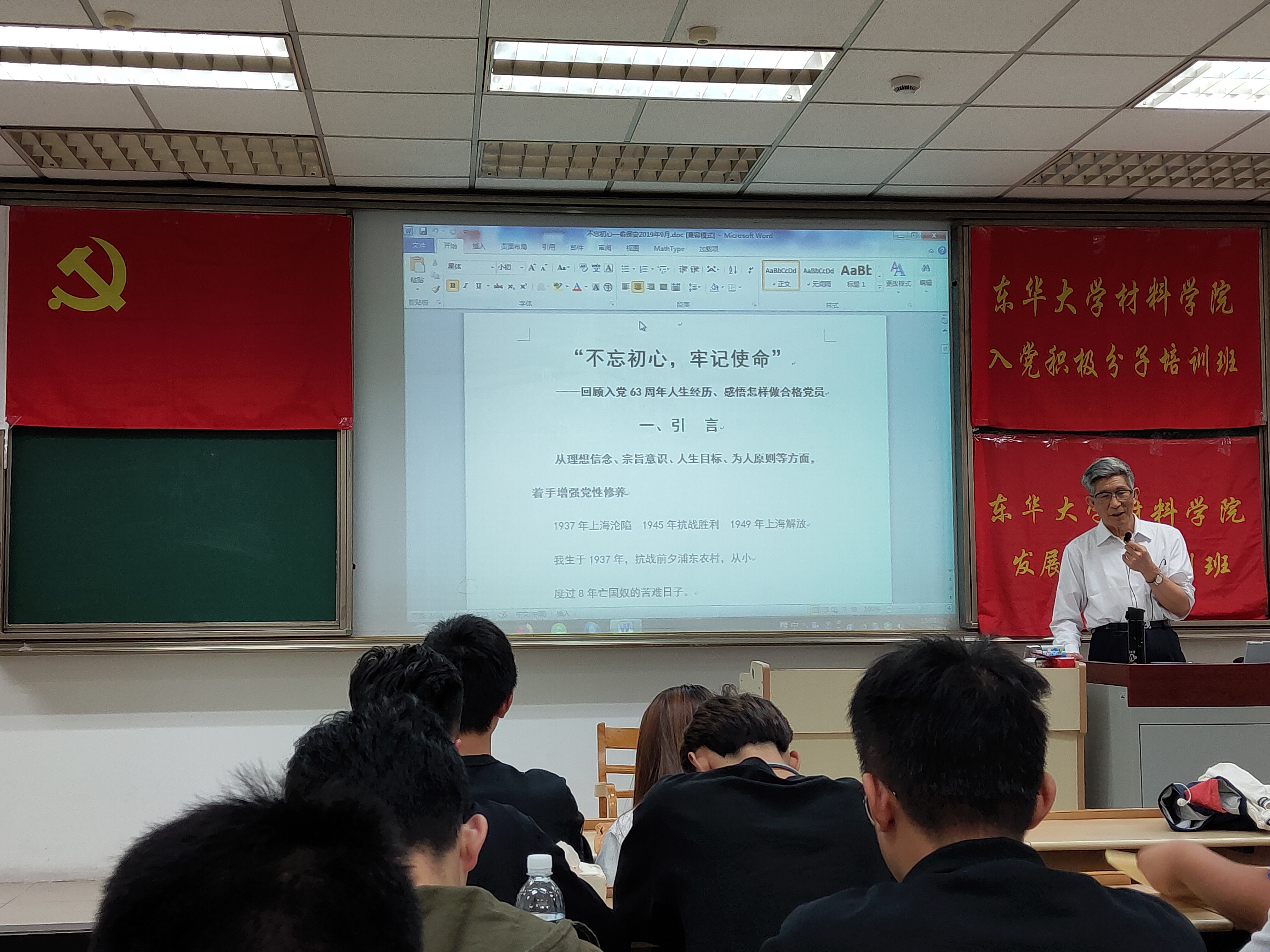 2019年10月22日下午13:00,yl23455永利2019年第二学期党校培训课程在松江校区1125教室举行,本次课程由材料公司党校主办,材料公司入党积极分子培训班学员、发展对象培训班学员以及信息、人文公司党校学员共同参与,主讲人关工委俞保安教授以“不忘初心 牢记使命——暨回顾入党63年人生经历 感悟怎样做合格党员”为主题开展专题讲座。