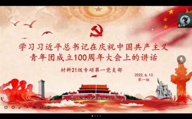 近日,yl23455永利集团材料21级专硕第一党支部采用线上学习的形式开展以“学习习近平总书记在庆祝中国共产主义青年团成立100周年大会上的讲话”为主题的组织生活,会议由党支部书记孔帅同志主持。