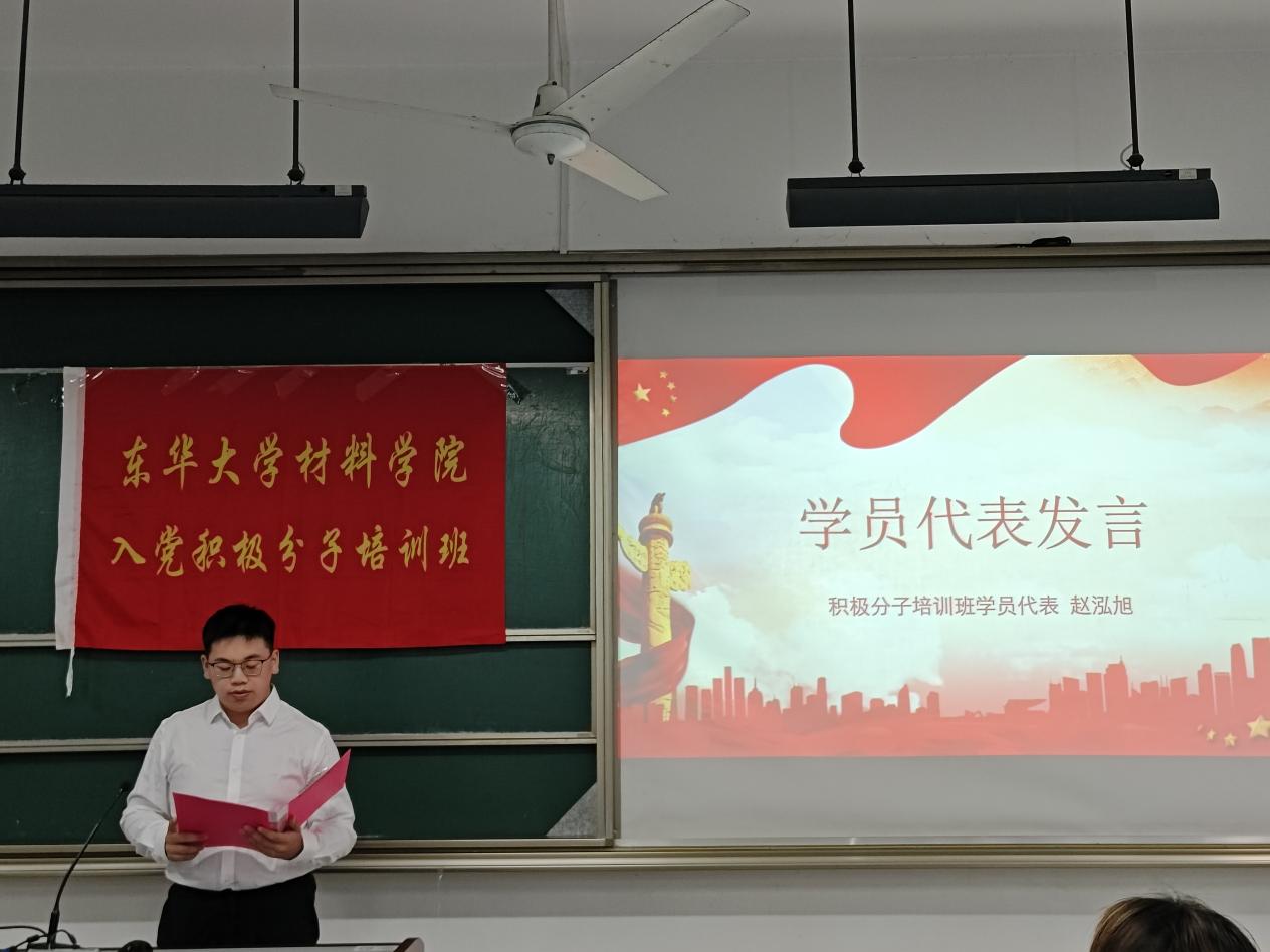 会上,学员代表赵泓旭同学结合党的二十大报告中的青年寄语,围绕“新时代青年肩负的责任与使命”展开了分享,他倡议所有学员,要“认真听讲,积极参与讨论,按时完成培训班的各项学习任务。以饱满的热情、坚定的信念、扎实的学风,投入到学习和实践中,不断提高自己的政治觉悟和综合素质,为实现中华民族伟大复兴的中国梦贡献自己的青春力量”。