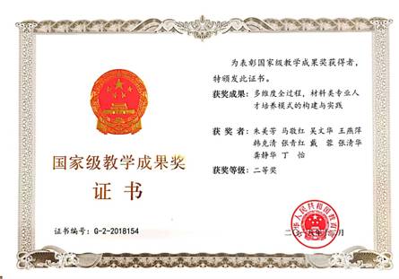 国家级教学成果奖 | 多维度全过程,材料类专业人才培养模式的构建与实践 | 2018 | 二等奖 | 朱美芳、马敬红、吴文华、王燕萍、韩克清、张青红、戴蓉、张清华、龚静华、丁怡 |